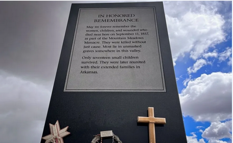 David Condos / KUER For over a century, historical markers at Mountain Meadows did not say who was responsible for the murder of more than 100 Arkansas emigrants in 1857. Recent additions like this monument along State Route 18 in Washington County as seen on March 24, 2024, show signs of change.